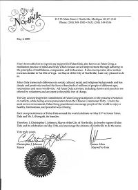 诺斯维尔市推崇法轮功学员在面对中国共产党严酷的镇压时仍然采取和平解决冲突的做法。在最严厉的环境之下,法轮功学员仍鼓励世界人民享受健康、和谐和平安的生活。