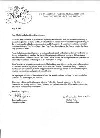 因此, 我、道格拉斯·宾汉姆和密切尔·菲齐特,作为诺斯维尔市的市议员,特在此支持法轮大法,庆祝五月十三日法轮大法日,并鼓励诺斯维尔市的市民支持法轮大法,庆祝法轮大法日。