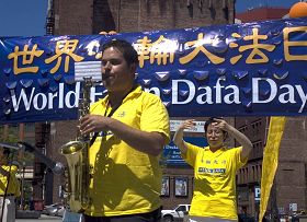 法轮功学员的男女声大合唱,歌声浑厚嘹亮有层次。尤其是“法轮大法好”歌曲,带动周遭不会唱的人也跟着唱,大家的歌声汇聚在一起,不断回荡在中国城的上空。这是法轮功学员从心中发出的声音,震撼了观众。歌唱完毕,人们报以掌声。