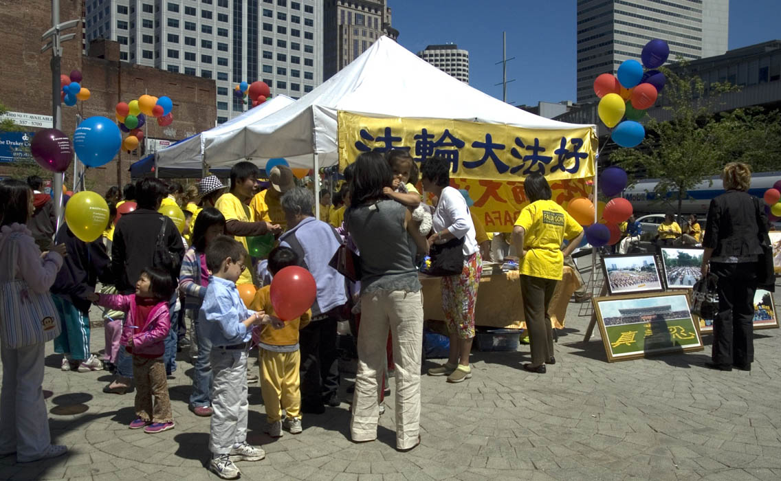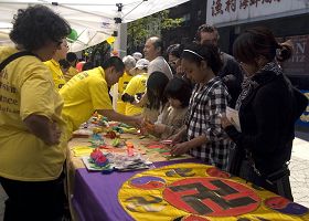 ![]() 法轮功展位前人群络绎不绝 |