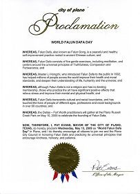 现在,因此,我,帕特。艾文斯,德州布兰诺市长,在此宣布二零零九年五月十三日为布兰诺市“世界法轮大法日”。我因此鼓励所有居民与我和市议会一起褒奖法轮大法并实践其鼓励善良、诚实和忍让的普世原则。
