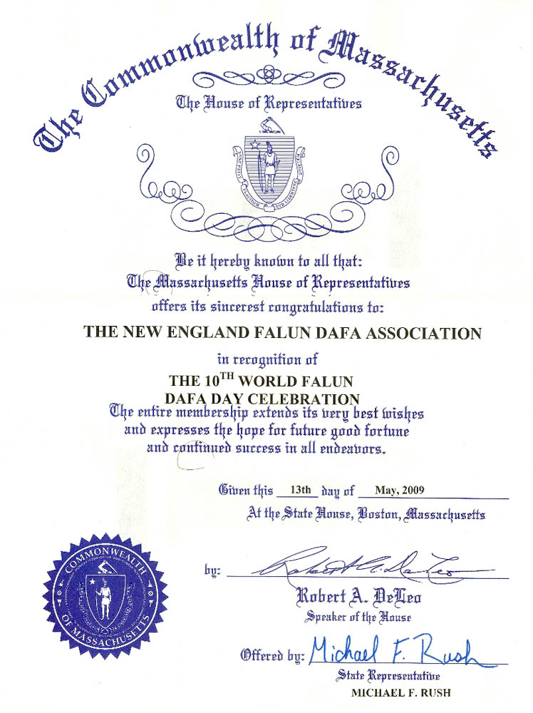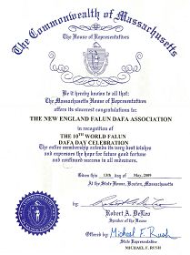 麻萨诸塞州众议院向新英格兰法轮大法协会致以最衷心的祝贺!