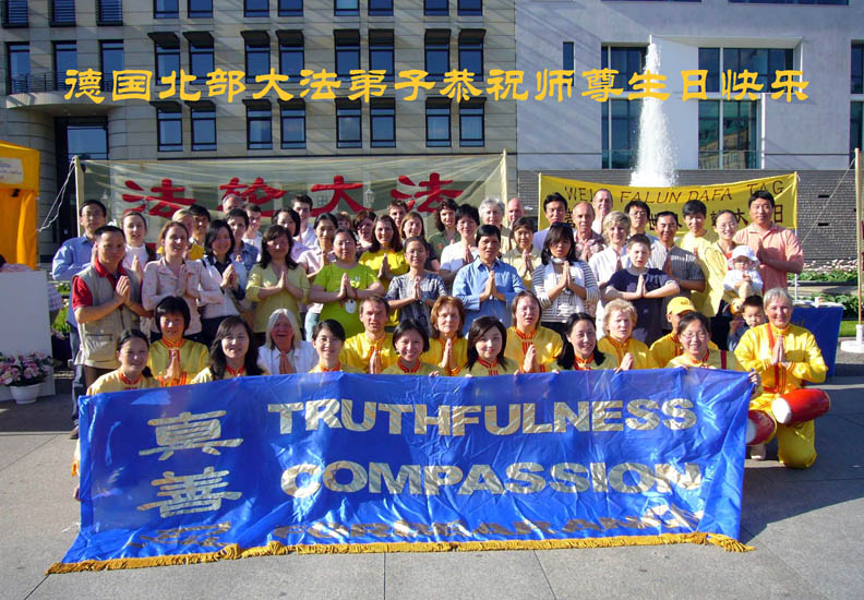 很多游客争相观看法轮功学员的功法表演,并纷纷用手机或照相机摄影留念。在人群中,有四位来自中国大陆的游客,一直站在那里,久久不愿离去。他们目不转睛地看着眼前的一切:迎风飘扬的“法轮大法”彩旗、金灿灿的“真善忍”横幅、欢腾雀跃的气球,排列整齐、祥和美好的炼功场面,不同年龄、不同种族、不同肤色的法轮功学员在打坐炼功,周围人们的赞不绝口……笔者看到他们的眼神从惊讶、不敢相信,然后转为沉思、最后慢慢变成欣慰和自豪。一位法轮功学员上前,正要跟他们说话,其中的一位男士立即说,“你不用说了,我们都知道。我们都是你们师父以前的同事……祝你们师父好,祝你们节日快乐!”