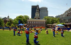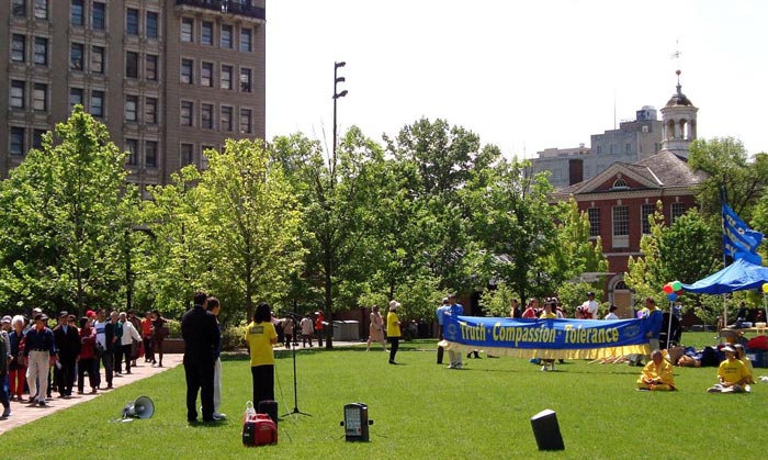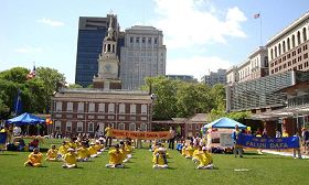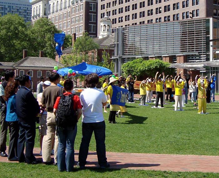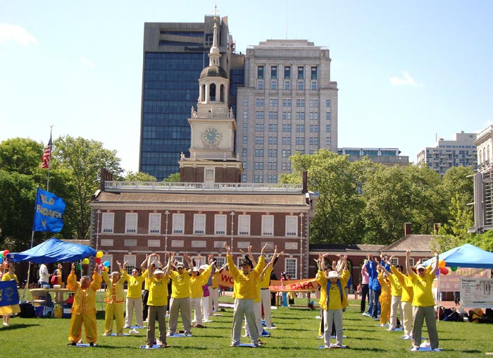 ![]() 大费城法轮功学员在独立广场演示功法 |