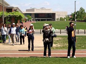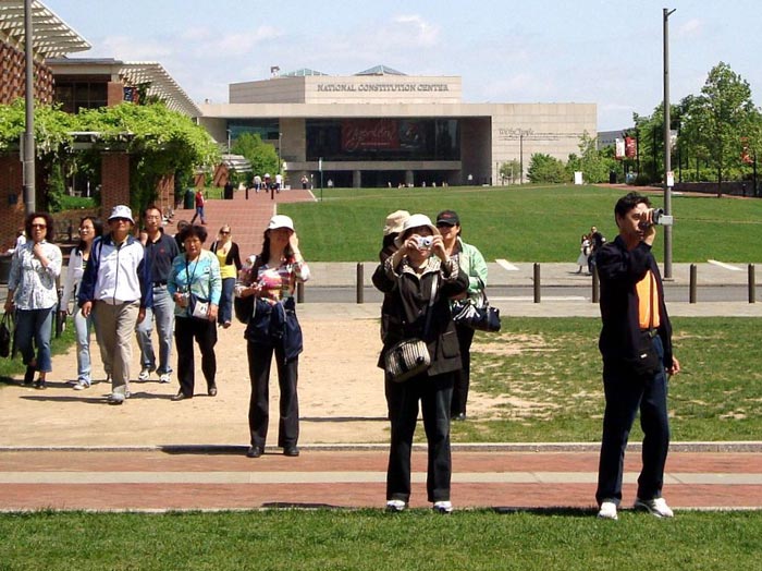 一个来自中国的旅游团从自由钟前草坪经过, 从草坪的一头到另一头, 他们边走边注视着法轮功学员炼功、表演的场面,好象被磁石吸引住了一样,回头一百八十度,离开很远了还看不够。一位三十多岁的女士从队伍中跑出来,疾步走到一位穿黄色T恤衫的法轮功学员面前,一把拉着这位学员的手,说:“我是北京的弟子,真高兴在这里看到你们,希望北京也快点有这么一天……。”