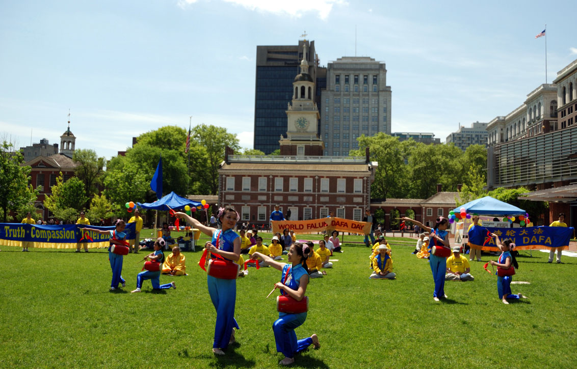 【明慧网二零零九年五月十二日】二零零九年五月十日中午,风和日丽的费城迎来了一年一度的世界法轮大法日。在象征美国自由发源地的独立宫前,来自大费城地区的法轮功学员和支持法轮功的各界人士欢聚在自由钟前的草坪上,以集体炼功、分享修炼体会、以及载歌载舞的方式表达他们对法轮功创始人李洪志先生的感恩,讲述中共迫害法轮功反助法轮功洪扬世界的真相,吸引了来自世界各地的游客,成为一道最亮丽的风景线。