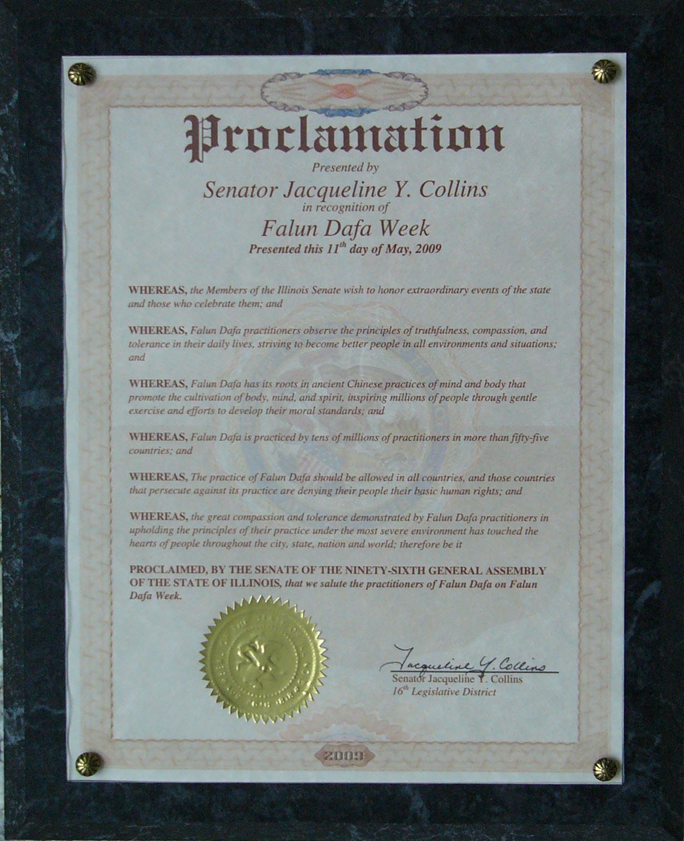 伊利诺伊州第九十六届参议院决定,在法轮大法周向法轮大法学员们致以敬意。