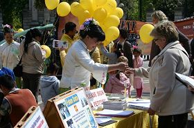 一位老先生接过传单,仔细阅读真相后,整个下午都在观看法轮功学员的功法演示和其它丰富多彩的表演,而不愿离开。