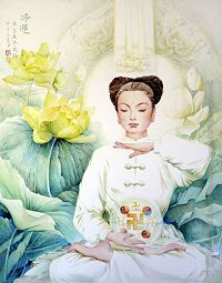 此图为真善忍美展的作品《净莲》,表现法轮大法修炼者在打坐中静穆美好的场面,少女头顶是她的功柱。