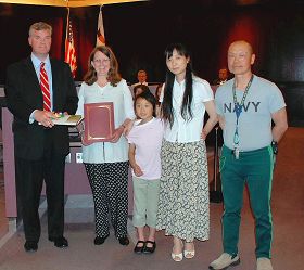 ![]() 盐湖县县长彼得•科伦(左)宣布法轮大法日后与学员们合影 |