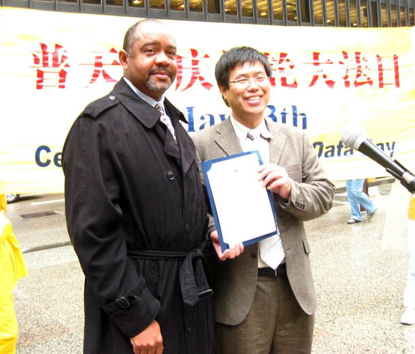 库克郡涵盖芝加哥市,有近五百三十万人口,是美国仅次于洛杉矶郡的人口最密集的郡。库克郡郡政厅主席托德•斯佼杰的助手斯达克斯(Alvin Starks)冒雨来到联邦广场,带来了斯佼杰主席的褒奖。
