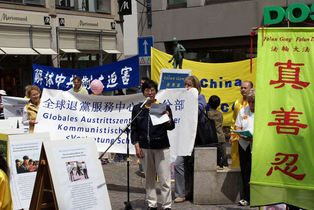 中午十二点,由“瑞士法轮功协会”和“全球退党服务中心瑞士分部”共同组织了在市中心的游行和集会。“全球退党服务中心瑞士分部”负责人潘女士在集会上发言指出,现在已经到了“解体中共,制止迫害”的时刻,她呼吁参加过中共组织的民众,抓紧时机,赶快“三退”(退出中共党、团、队),为自己争取一个美好的未来。