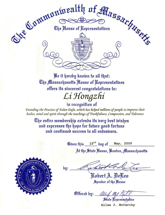 麻萨诸塞州众议院向李洪志先生致以最衷心的祝贺!