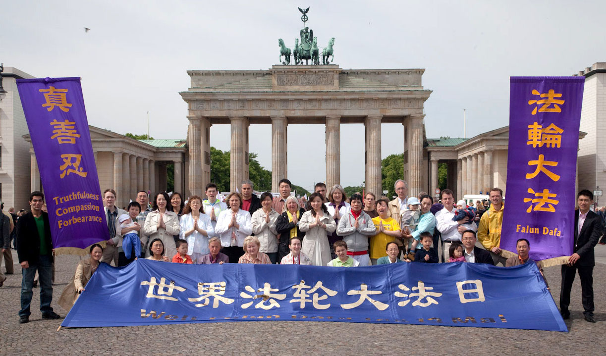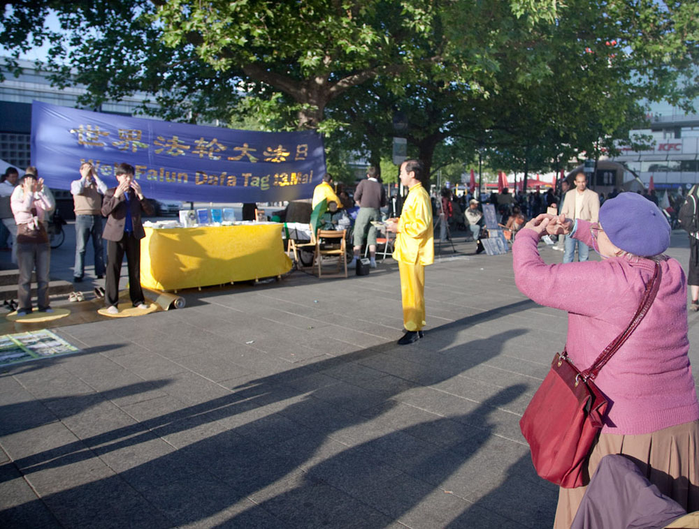 五月十三日是第十届法轮大法日,一些来自柏林(Berlin)、汉诺威(Hannover)、比利菲尔德(Bielefeld)和德累斯顿(Dresden)的法轮功学员在柏林著名景点纪念教堂(Gedaechtniskirche)边的布莱柴特广场(Breitscheidplatz)申请了一个摊位,展示法轮功功法,分发多种语言的关于法轮功的资料并征集谴责中共迫害的签名。二战之后,这座在二战中大部份被炸毁的教堂就成了柏林的象征,因为教堂紧挨柏林最繁华的购物街,所以教堂旁的广场上也人来人往非常热闹,广场上几棵大树投下的阴凉里的长凳也成为人们休憩的好地方。画肖像的、表演舞蹈和乐器的艺术家们也纷纷来到这里展示他们的技艺。