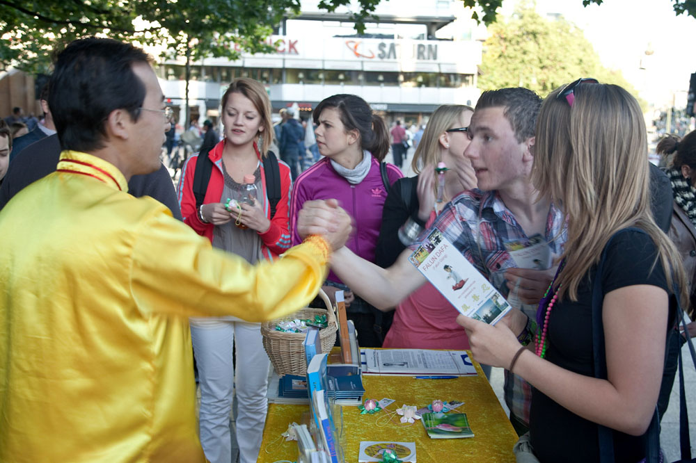 照片上和法轮功学员握手的德国年轻人一开始只是和两个同伴很偶然地走过法轮功学员的摊位,观看炼功很长时间。等到晚上七点多活动快结束的时候,他又出乎意料地带来了十几个和他同龄的年轻人回到了法轮功摊位,除了每个人都拿了关于法轮功的真相资料,听法轮功学员的讲解之外,一位中国法轮功学员还一字一句地教他们说:“法轮大法好。”这些德国年轻人虽然无法学得字正腔圆,但是都非常认真。