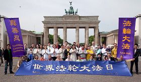 ![]() 二零零九年五月九日星期六,部份柏林法轮功学员在柏林著名景点博兰登堡门(Brandenburger Tor)前合影,预祝师尊生日快乐,并庆祝法轮大法日。 |