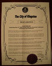 在二零零九年五月十三日世界法轮大法日前夕,加拿大安大略省金斯敦市市长哈维洛森褒奖二零零九年五月十三日为法轮大法日,曁表彰真善忍的原则。