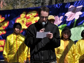 西人法轮功学员Dane Crocker在发言时感谢师尊李洪志老师把宇宙真理传给了世人。 “几千年来,人们苦苦探索宇宙和生命的意义。李洪志老师第一次把真善忍的法理传给了世人,使人们真正明白了宇宙的法理。”他说:“今天,让我们一起拥抱真善忍,并庆祝这个伟大的日子。”