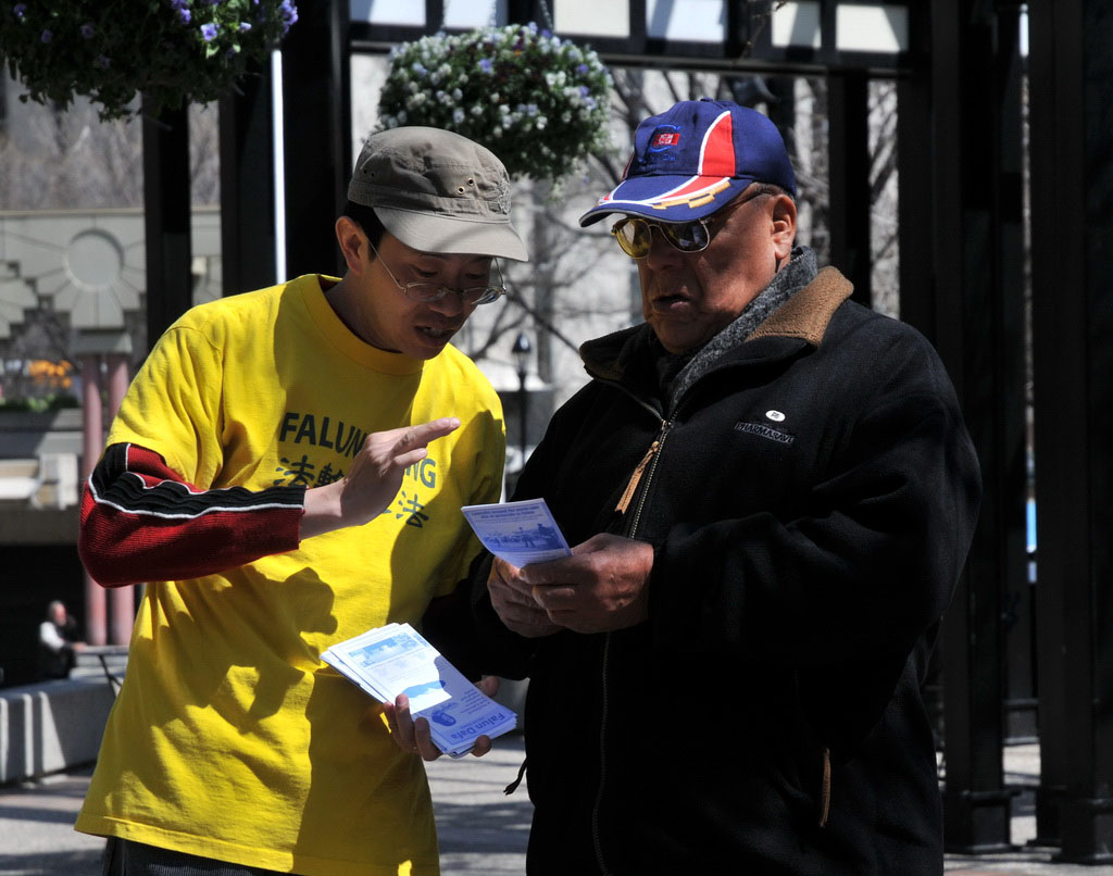 当了解法轮功洪传一百一十四个国家和地区,《转法轮》已经被翻译成三十多种文字时,他直说太棒了,并问:“我现在可以买到那本书吗?”当法轮功学员告诉他可以从传单上提供的网站上免费下载后,他还是恋恋不舍不愿离开,一直到庆祝法轮大法日二个多小时的活动结束。