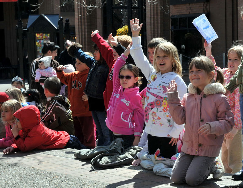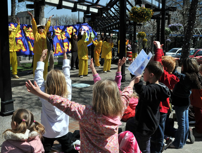 ![]() 活动期间,当法轮功学员炼动功时,一群小学生围了上来,有的趴在路边的石阶上看功法演示,有的则随着法轮功学员学起了“冲灌”的动作。 |