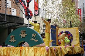 ![]() 法轮功学员在花车上演示功法,展示大法的美好。 |