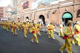 走在游行队伍最前方的第一个方阵是雄姿威武的法轮大法天国乐团方阵,《法轮大法好》、《法鼓法号震十方》、《法正乾坤》等乐曲回荡在人们的耳畔;鼓乐雄壮有力,震撼着人们的心灵;展现了法轮功学员的铮铮骨气和顽强的生命力。他们整齐的队伍、雄壮威武的气势,整齐的队列与步法,以及充满活力的乐曲,赢得了人们的赞赏。尤其这些法轮大法修炼者流露出的祥和、奕奕神采,引来不少路人的钦佩目光。