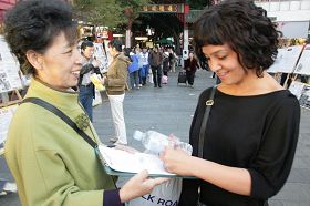 ![]() 人们索要传单,和了解更多关于法轮功的详情后签名声援法轮功。 |