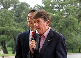 已八届连任的德州众议员Elliott Naishtat,一向鼎力支持法轮功反迫害,谴责中共迫害人权。他不顾风雨来到现场,向来自德州各地的法轮功学员祝贺法轮大法日。他说,“美国的立国之本就是自由,发生在中国的人权迫害,包括对法轮功的迫害必须被制止。”他希望今天的活动能帮助美国人了解到中共对于人权的迫害。他最后充满希望说“相信世界上人们公开、自由地修炼法轮大法,也包括中国,再一个十七年,再一个十七年,永永远远。”