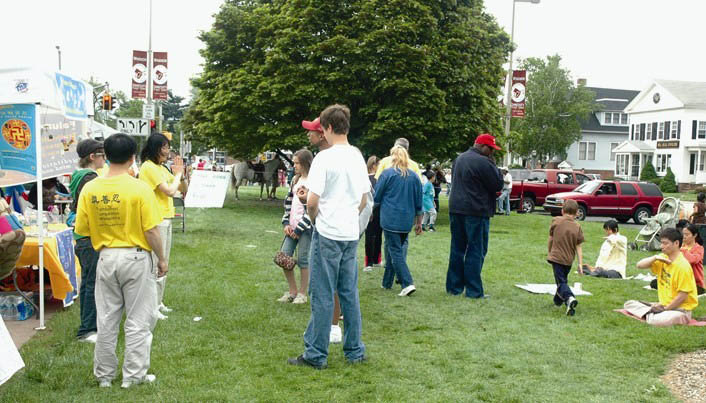 【明慧网二零零九年五月二十日】二零零九年五月十六日,法轮功学员参加了在美国康奈狄克州温泽市的筛德德比(Shad Derby Parade)游行。随后,又在游行后的集市上进行了洪法和功法表演、教功活动,受到民众的欢迎。