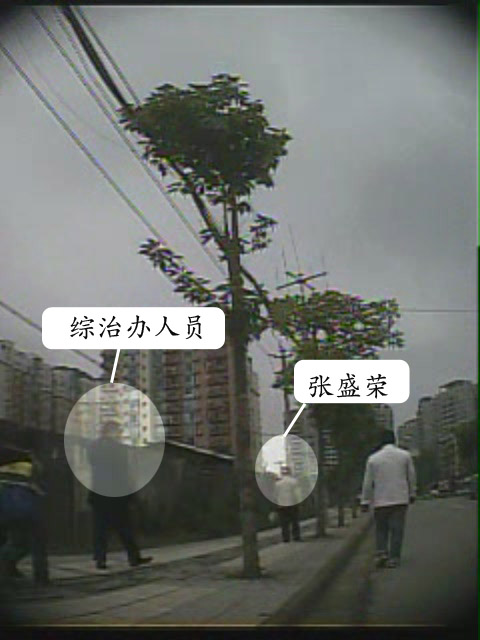 ![]() 张盛荣上街买菜时,监控者紧随其后 | ![]() 参与监控张盛荣的晋阳综治办人员之一 | ![]() 张盛荣上街去商场时,监控者近距离跟踪,打电话汇报 |