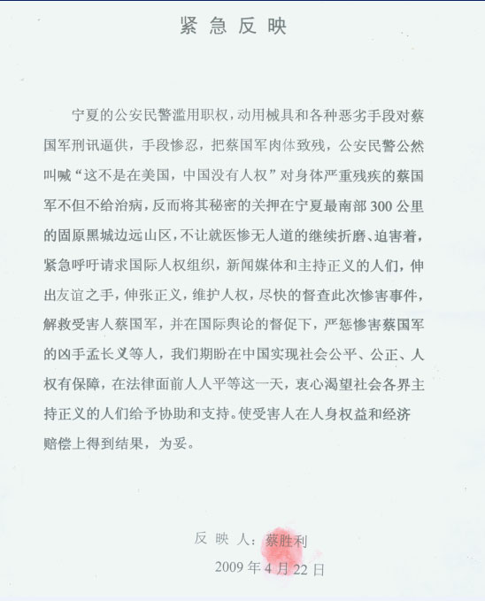 ![]() 蔡国军之父蔡胜利紧急反映中共恶警对蔡国军的残酷迫害 |