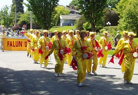 【明慧网二零零九年五月二十四日】二零零九年五月二十三日,温哥华法轮功学员应邀参加一年一度加拿大卑诗省新西敏市的海耶克嘉年华(Hyack Festival)游行。法轮功团队是当天最长的游行队伍,古装队、仙女队、炼功队和腰鼓队以及花车经过的时候,沿途观众不断鼓掌,并欢呼“法轮功!”“法轮功!”许多观众热情地索取法轮功真相资料。据分发资料的法轮功学员统计,沿途共派发了三千多份传单。