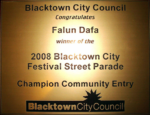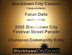 ![]() 二零零八年五月三十一日,法轮功学员参加了一年一度的悉尼西部布莱克镇(Blacktown)节日大游行,获得冠军奖牌 |