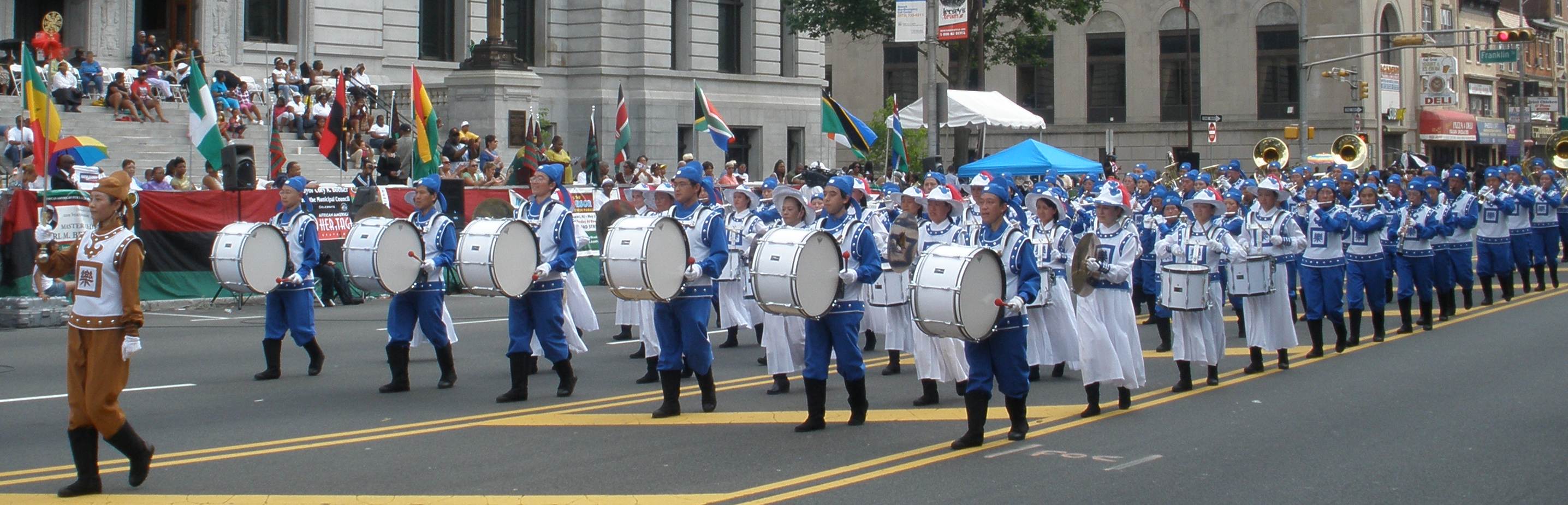 随着观众的雀跃欢呼,纽瓦克市政府大楼前观礼台上主持人介绍说:“欢迎法轮功天国乐队的到来!天国乐团的成员都是法轮功修炼者,他们修炼的原则是‘真、善、忍’。”
