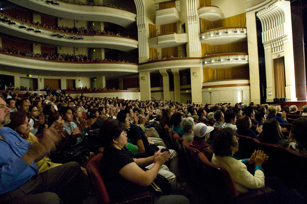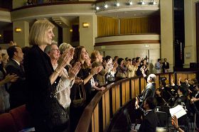 ![]() 演出结束时,现场观众纷纷起立长时间鼓掌向演员致意,直至大幕落下,不再开启,才慢慢离去。 |