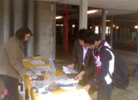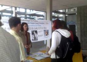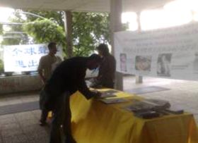 学员在此,有的演示法轮功功法,有的向围观的人们讲真相。很多人驻足观看;有很多明白了真相的学生签名支持反迫害。
