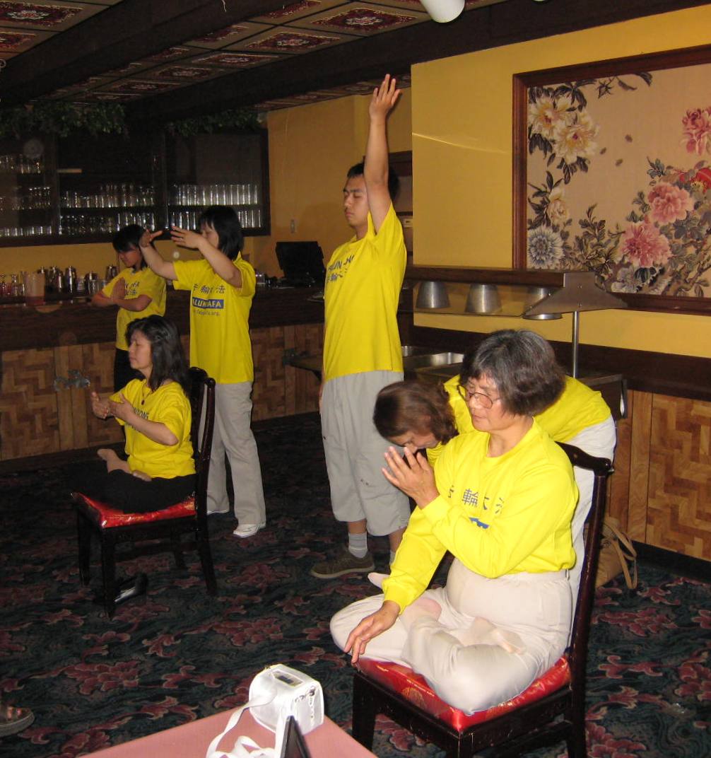 活动在一家中餐馆的大餐厅举行。大厅里座无虚席,约有六十名员工前来了解法轮功。一位学员首先以幻灯片向大家介绍法轮大法遭迫害前在中国洪传的盛况、现在在世界洪传的情况,以及中共对法轮功修炼者长达十年的非人迫害。接下来,她介绍了法轮功功法的 特点,然后其他学员演示功法。