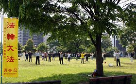 二零零九年四月二十九日上午十点,日本熊本地区的法轮功学员们在熊本市白川公园举行了大型集体炼功,随后在熊本市中央公民馆交流修炼体会。
