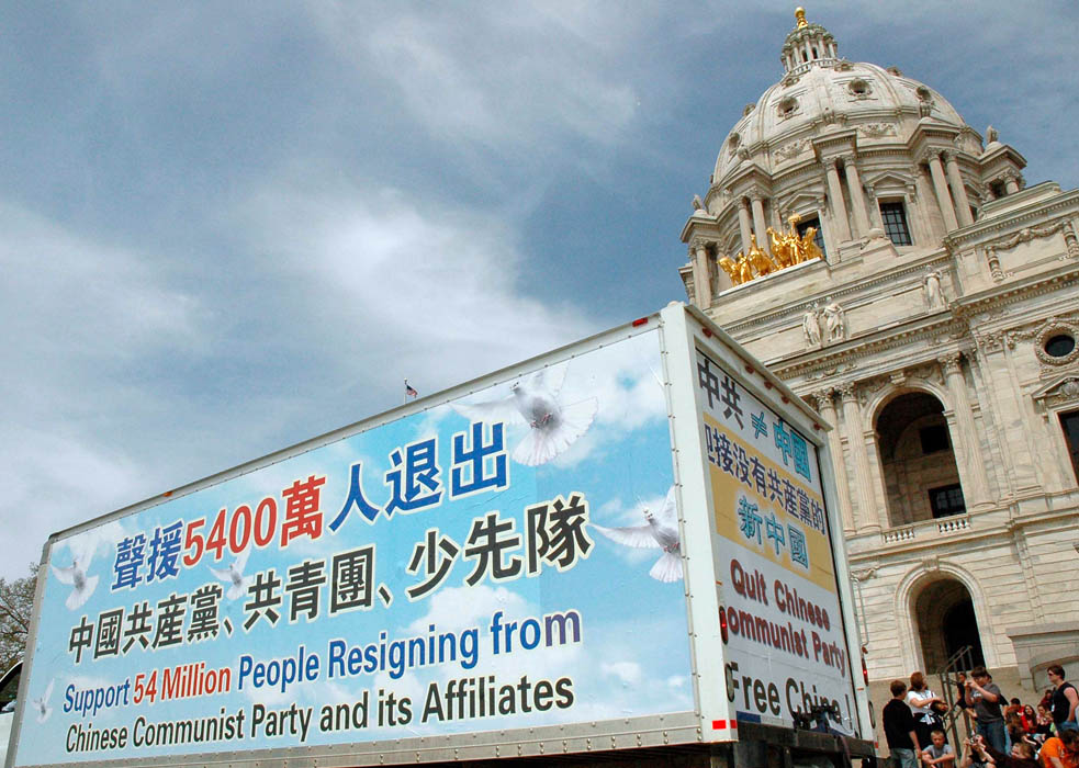 ![]() 美中退党服务中心的传递真相汽车之旅在双子城州议会大厦前 |