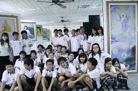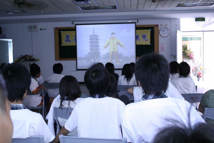 ![]() 学生们专注观看法轮功创始人李洪志先生示范教功录像,并亲身体验炼功乐趣 |