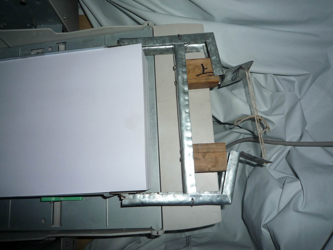 用原装带的防滑垫,把后边的挂钩做直与板成90度,再做一个与挂钩宽度相当的夹子,夹子的轴心用比较粗的钢丝绳做成的簧,产生摩擦力以控制纸张,防止带纸。需注意的是两侧的防滑垫做成上窄下宽的形状,优点是防滑垫与纸张总保持最好的摩擦效果。里面的木垫和拉绳是为了控制夹子张口大小。(详见图片)