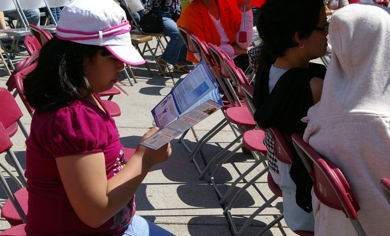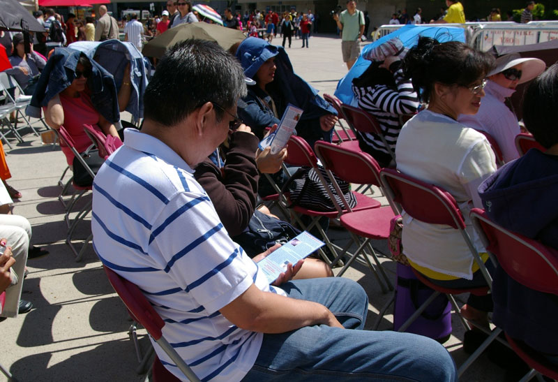 法轮功学员表演的腰鼓和功法演示,赢得了广场上观众的热烈掌声。不少观众站起来拍照。很多人在认真地阅读介绍法轮功的资料,并向现场的法轮功学员咨询。