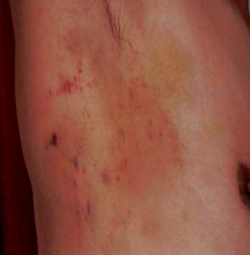 李凤珍被直接送到洗脑班(迁安市老种子公司)三楼,从楼门开始,恶警就拉着手铐往上曳李凤珍,导致腰等部位拉青(如图,照片为五月二十日拍摄)。洗脑班头子杨玉林上去就打李凤珍的嘴巴,三颗牙被打活动,当时嘴角就留出了血。
