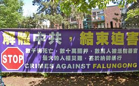 一位八十八岁的老华侨特意走到每一个横幅前仔细阅读,当他站在写着“中共=暴力+谎言”的横幅前时,不禁发出赞叹:“写得太好了,这些横幅写得太精辟了﹗”