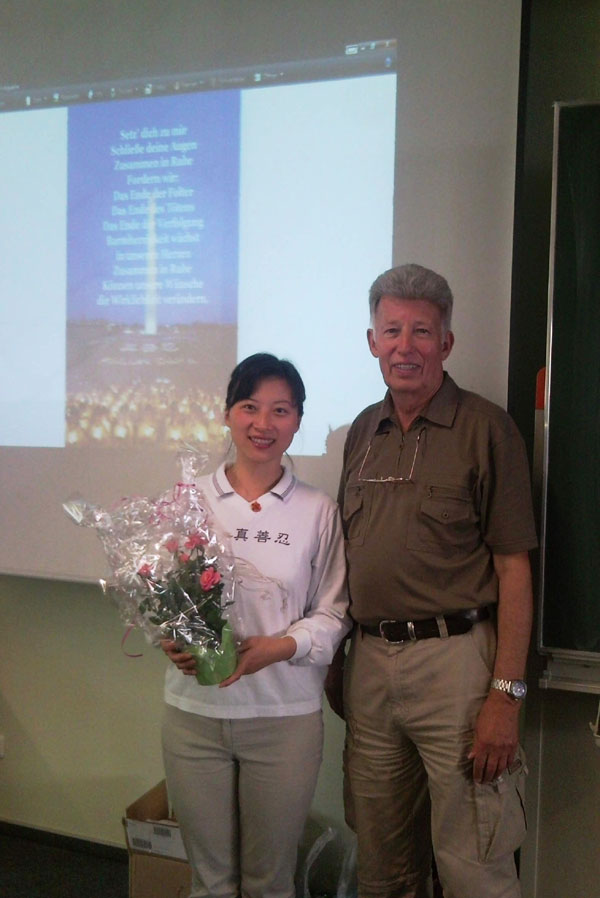 【明慧网二零零九年六月二十一日】“弥勒伸腰”,“抻”, “放松”,祥和的炼功音乐使德国卡尔-弗里德里希-高斯 (Carl-Fridrich-Gauss,CFG)高中的学生感到一阵轻松愉快,七十多位同学和教师饶有兴趣地跟随着滕·施为格( Teng-Schwaegerl) 女士在人权报告会的间隙尝试了法轮功的第一套功法“佛展千手法”。