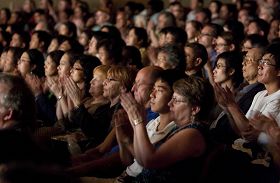![]() 二零零九年六月二十一日晚,在新泽西州上演的神韵晚会爆满,观众沉浸在完美艺术的享受中。 |