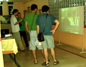 ![]() 参观者们在投影机前聚精会神地观看法轮功真相片 |