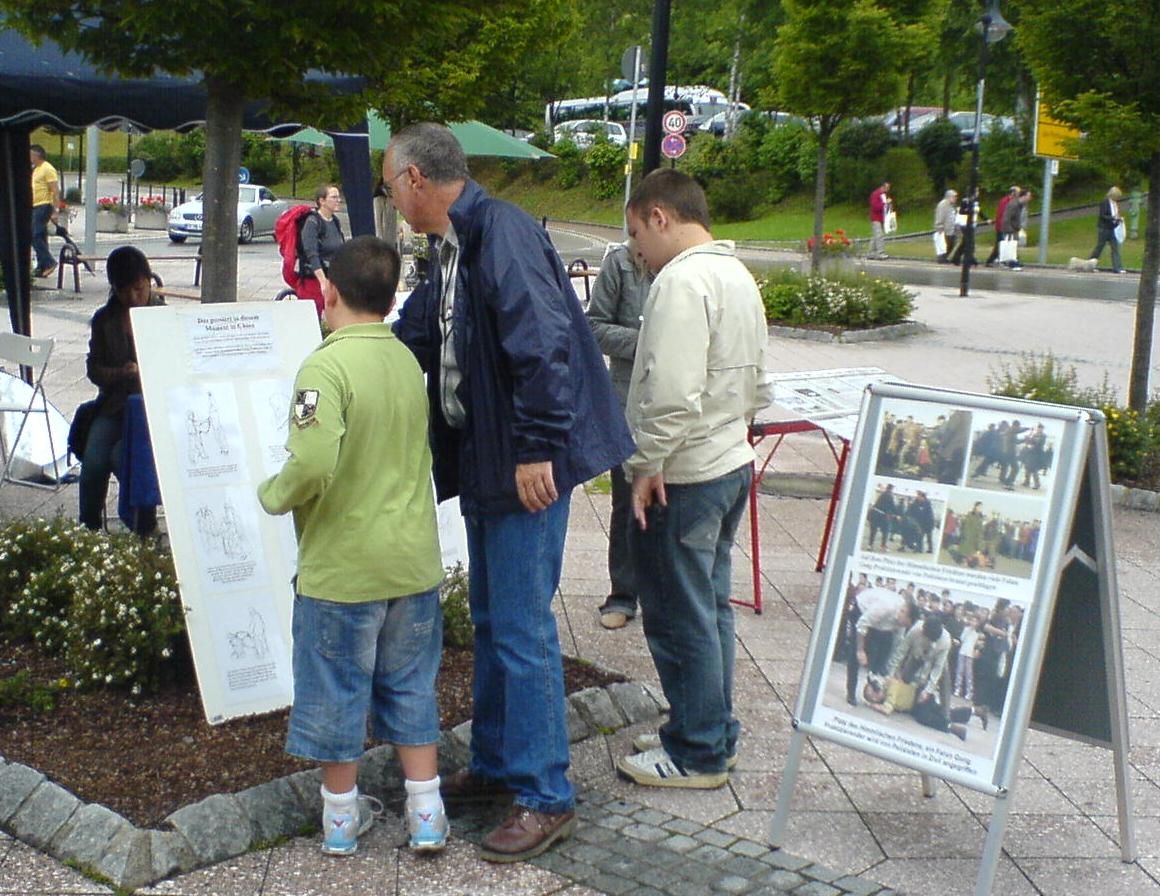 ![]() 游人认真观看法轮功真相展板 |