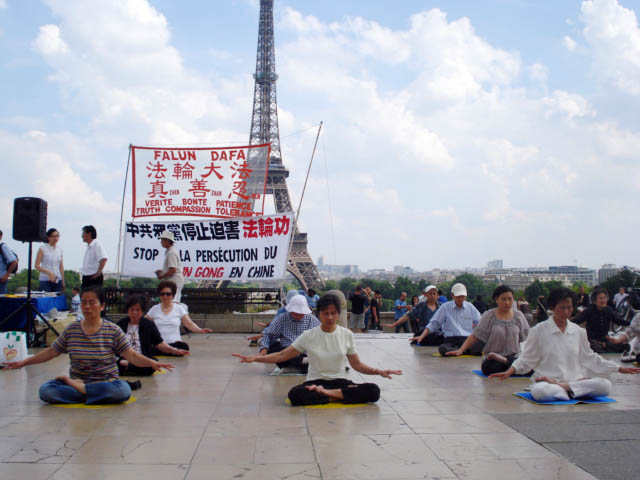 ![]() 巴黎尔菲尔铁塔边的人权广场上,学员表演法轮功功法 |