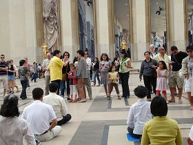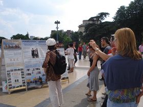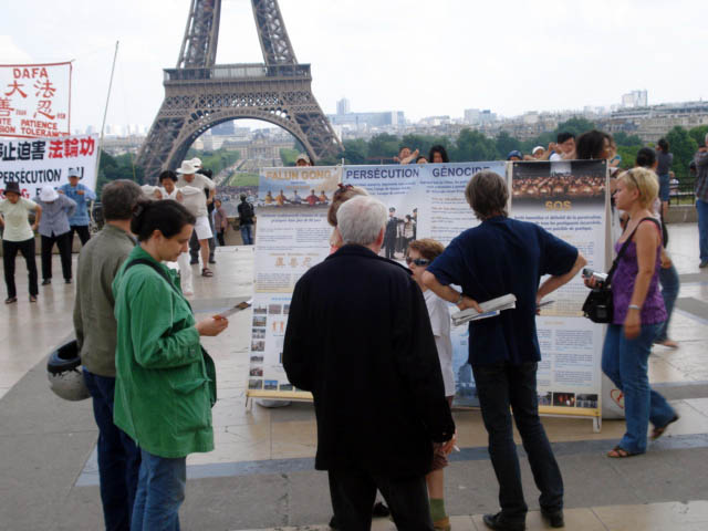 自一九九九年七月,中共开始了对法轮功的残酷迫害。从那时起,法国的法轮功学员就开始了讲真相、反迫害的活动。每个月除第一个星期日外,每个星期日下午,只要不下雨,法轮功学员就会出现在巴黎的著名旅游景点——埃菲尔铁塔下。这里是世界各地游客的必经之地,学员们准备了各种文字的法轮功真相传单,向游客派发。近十年来,学员们坚持不懈地讲真相,千千万万的人知道了法轮功,知道了中共对法轮功的迫害,人权广场上的真相点也成为巴黎旅游景点的一道独特风景。